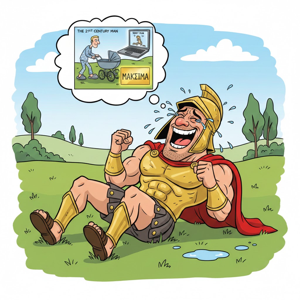 12.02.26 | Se for deg en velbygd mann i slutten av tyveårene rulle rundt på en eng oppløst i tårer. Det er tårer fremkalt av en latter så betydelig at vi må tilbake til begynnelsen av 2000-tallet og David Brent for å finne lignende latterbrøl. Vet du hvem som ruller rundt der? Det er Aleksander den store. Han har nettopp sett inn i fremtiden og overvært en kortfilm på en webside om the 21st century man. Han ante ikke at menn i fremtiden ville ha tøffelfasong og podevogn. Men heldigvis fant han en annen webside noen strakser senere.