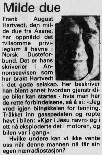 21.02.26 | Den milde due fra Åsane vs. The Real Jesus fra Åsane. Visste du at min far ble innlemmet i Norsk Dusteforbund på 1980-tallet? «Hvilke undere kan vi ikke vente oss når denne mannen nå får sin egen nærradiostasjon?», spurte Bergens Arbeiderblad den gangen. Avisen påpekte at min far tidligere hadde forsøkt å starte bilen sin i «Jesu navn». Ironien er fortreffelig her jeg sitter på Vy-toget på vei til Voss med fremragende «Losing My Religion» på øret. «Hvilke undere kan vi ikke vente oss?» Vel, i 2026 kommer svaret. Sirkelen er sluttet.