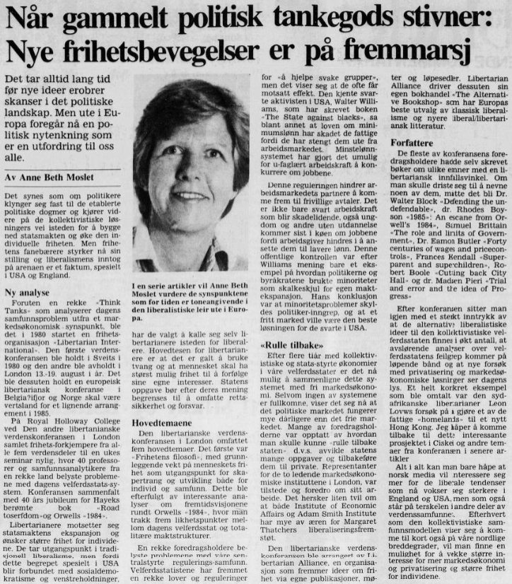 For øvrig: Jeg kom over artikkelen «Nye frihetsbevegelser er på fremmarsj» fra Morgenbladet, publisert en måned før jeg fylte syv år og rundt tretti år etter at Murray Rothbard privat begynte å bruke og definere begrepet libertarianisme (artikkelen ble publisert 14. september 1984). Her fungerer journalisten som en tidlig observatør: hun introduserer et norsk publikum for begrepet og ideologien – en tradisjon som, i motsetning til den langt mer omtalte Ayn Rand, har forblitt en nesten uutforsket kilde og side i norsk idéhistorie.